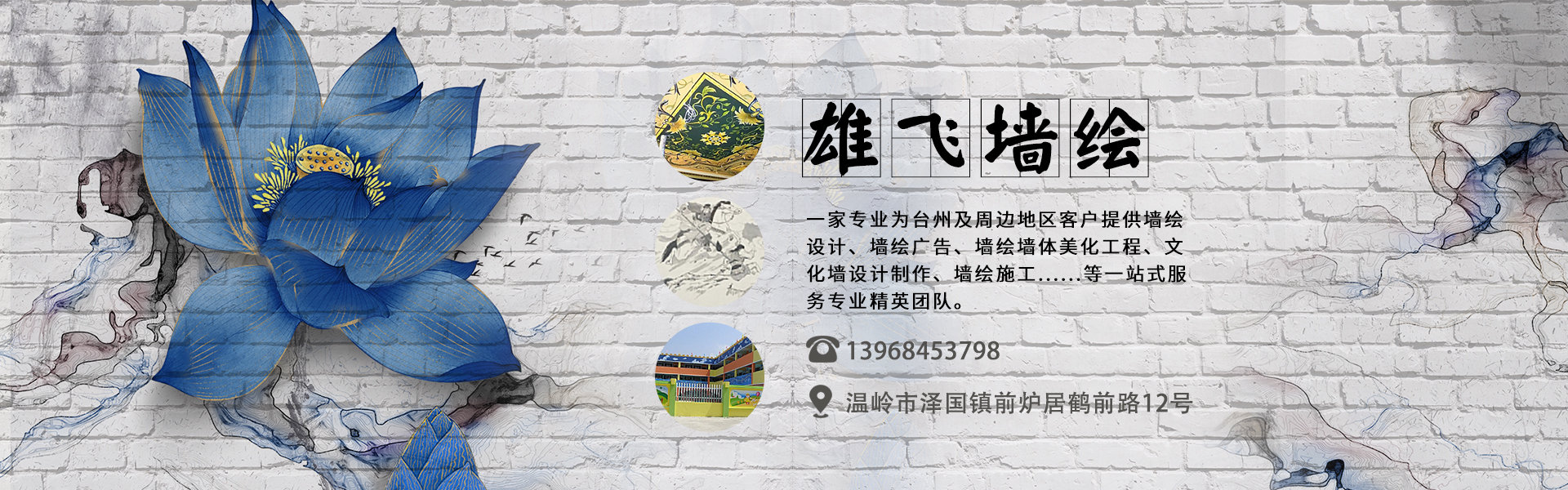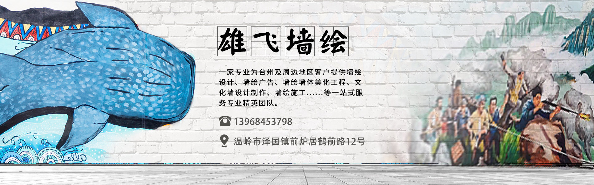 臺(tái)州市雄飛墻繪有限公司 ? 位于臺(tái)州溫嶺市,是一家專業(yè)為臺(tái)州及周邊地區(qū)客戶提供墻繪設(shè)計(jì)、墻繪廣告、墻繪墻體美化工程、文化墻設(shè)計(jì)制作、墻繪施工......等一站式服務(wù)專業(yè)精英團(tuán)隊(duì)。畫師均畢業(yè)于中國(guó)美院、西安美院等各...